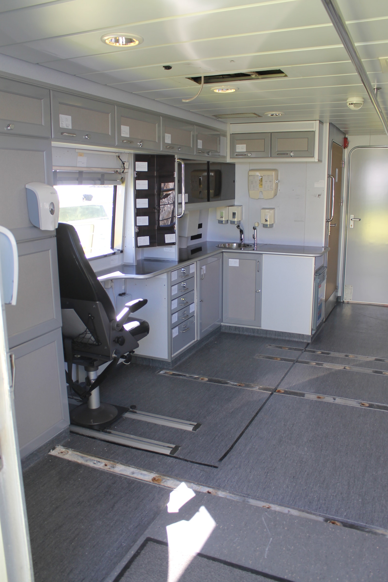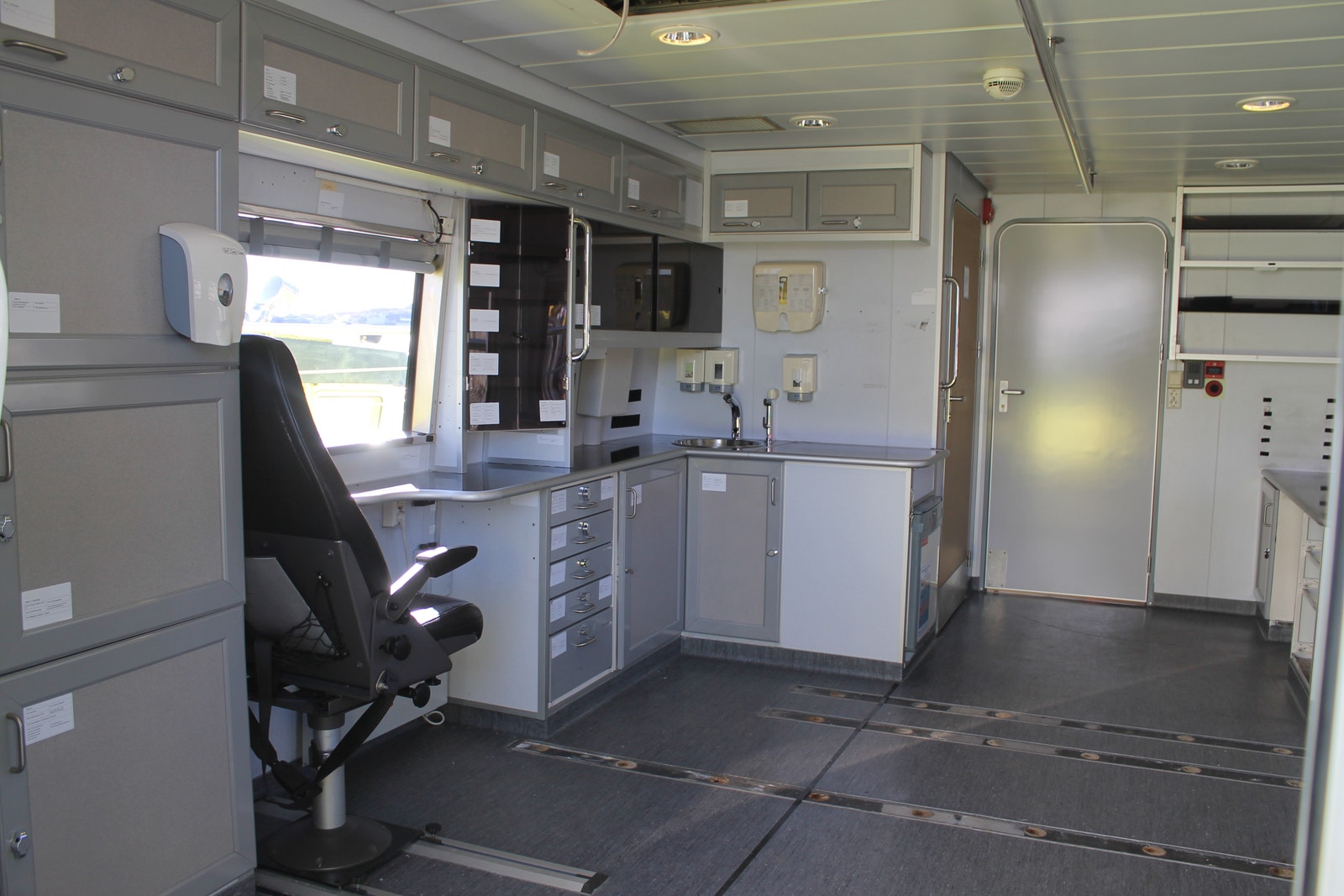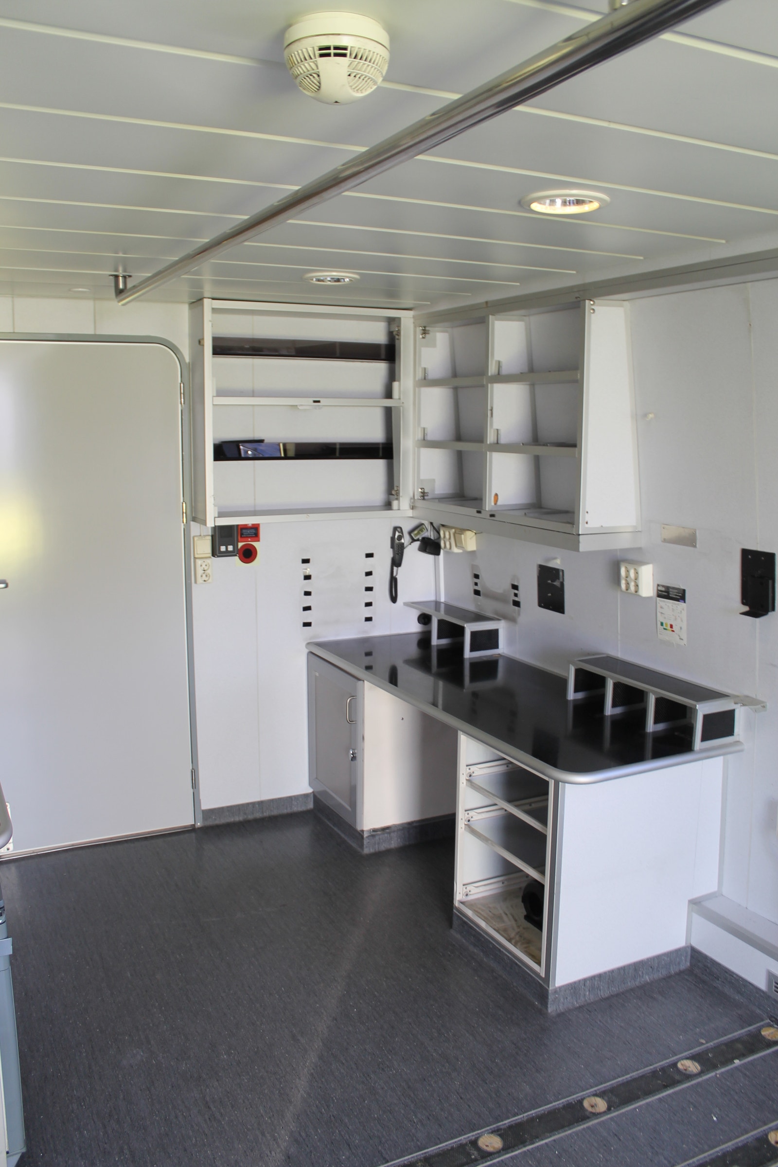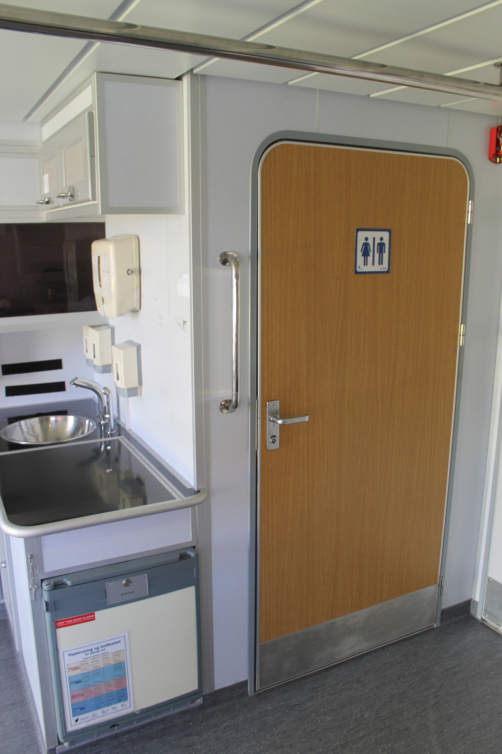 Ambulanserom med stor dørkplass, skapplass og kjøleskap samt egen vask med dusjhode og automatisk kran