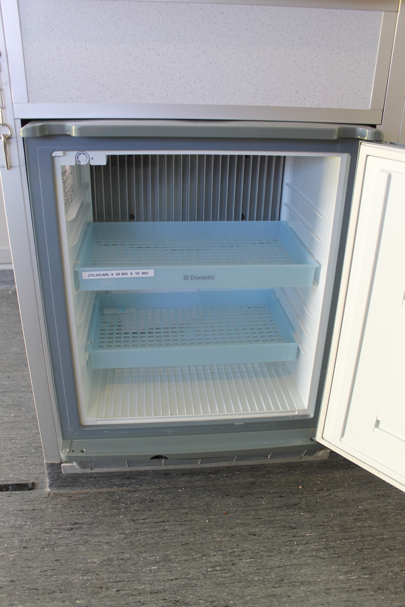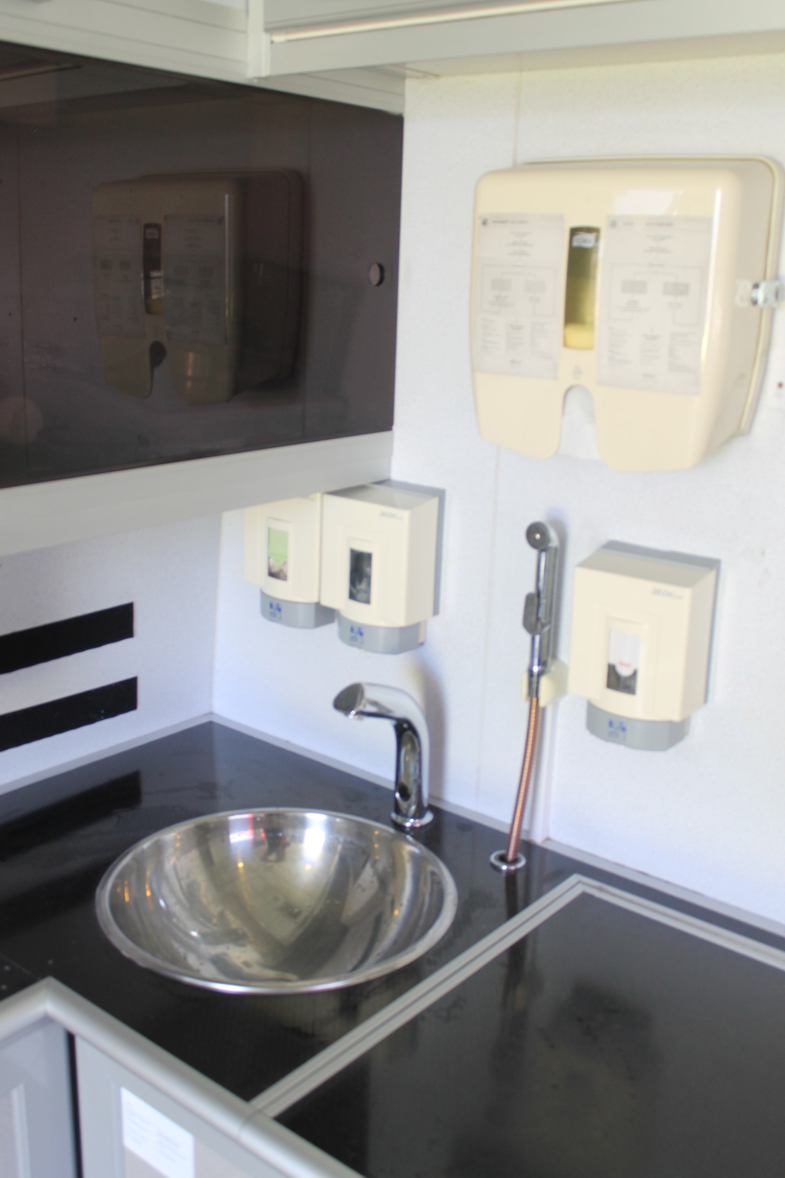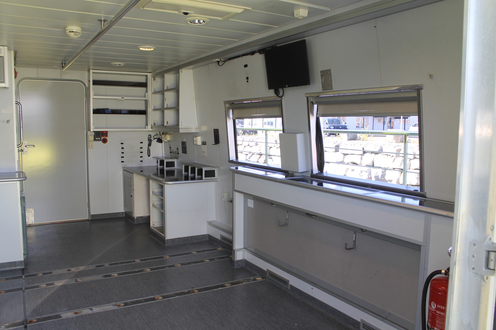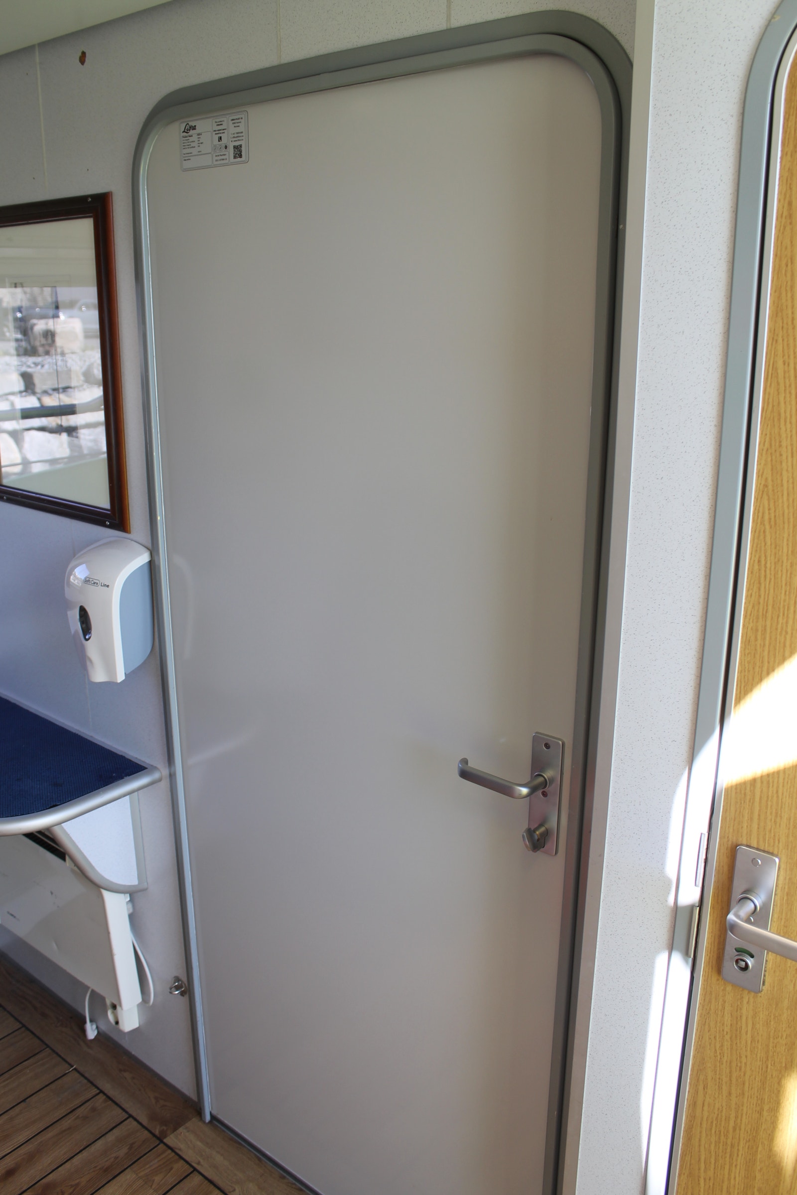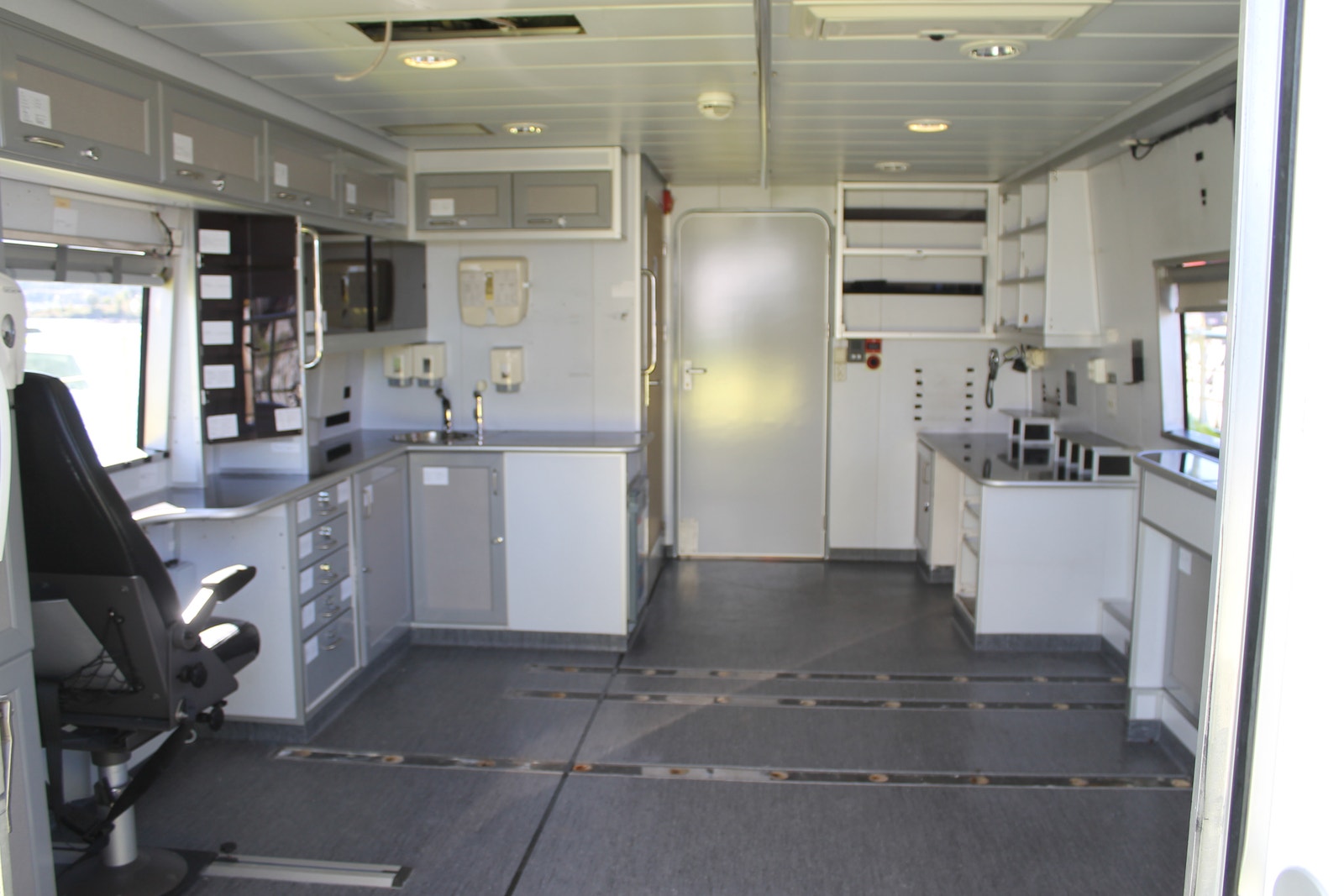 Ambulanserom med stor dørkplass, skapplass og kjøleskap samt egen vask med dusjhode og automatisk kran