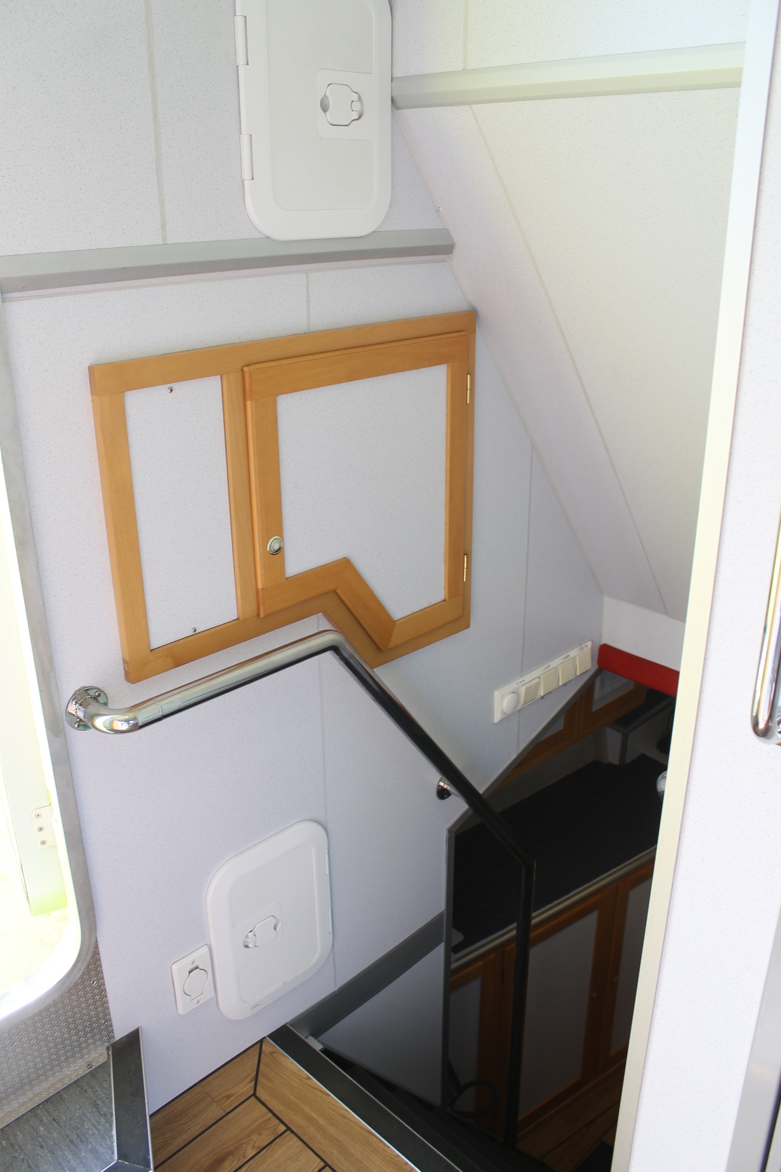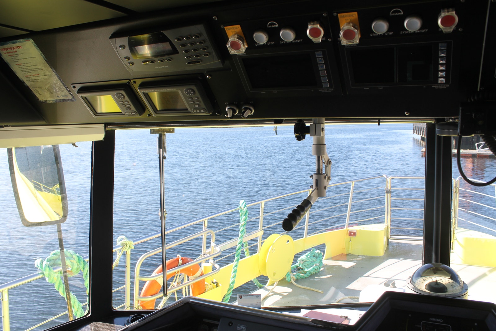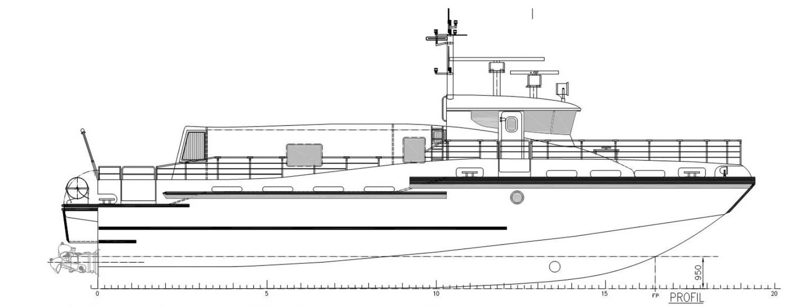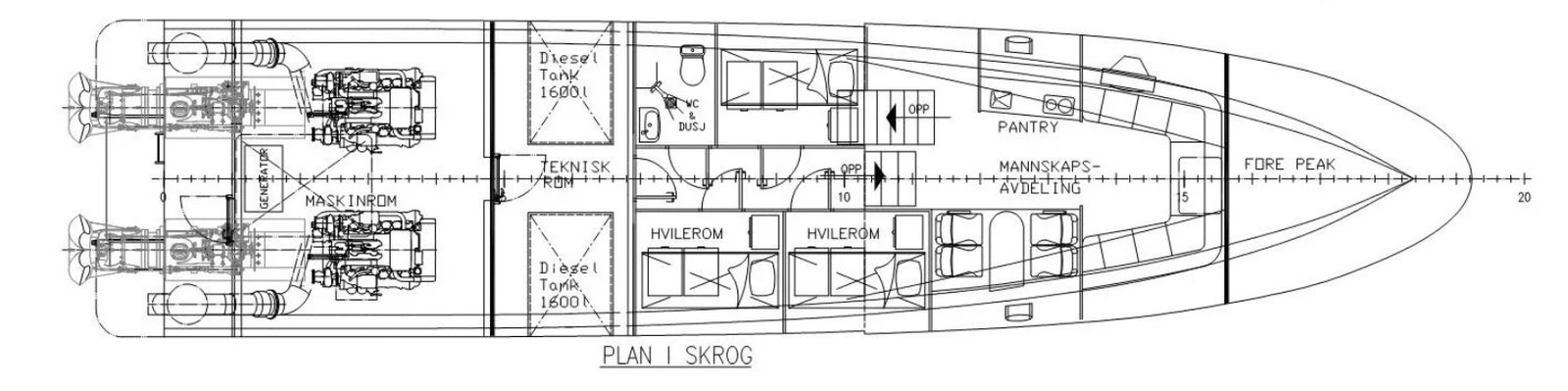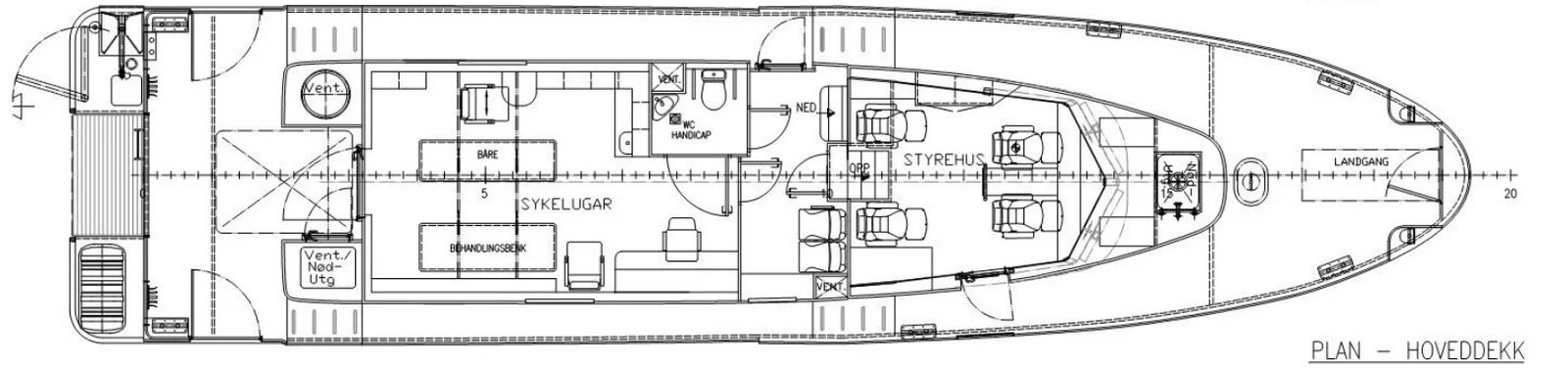 Callinganlegg mellom rorhus og lugarer, maskinrom, legestol og ut akter