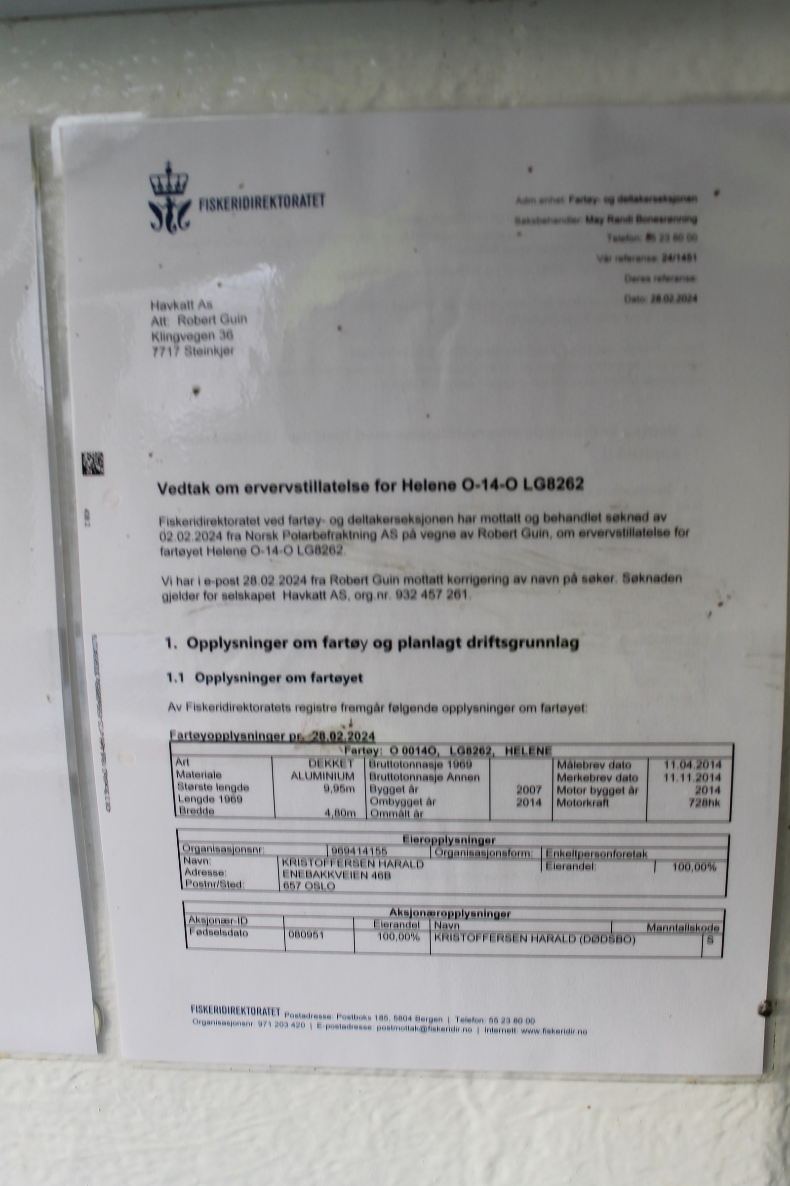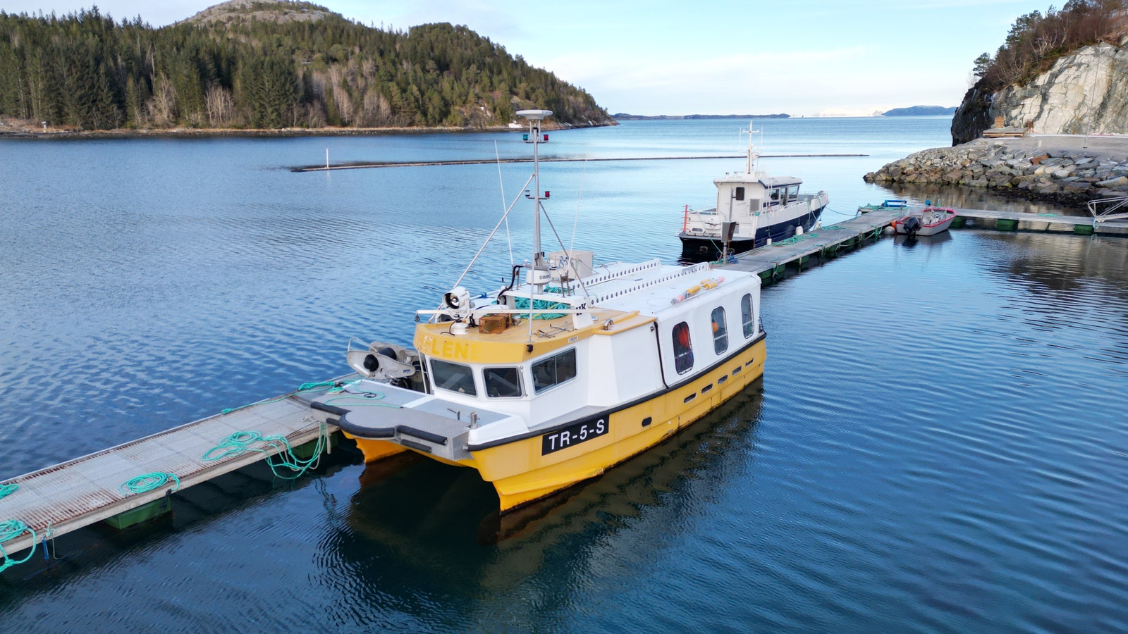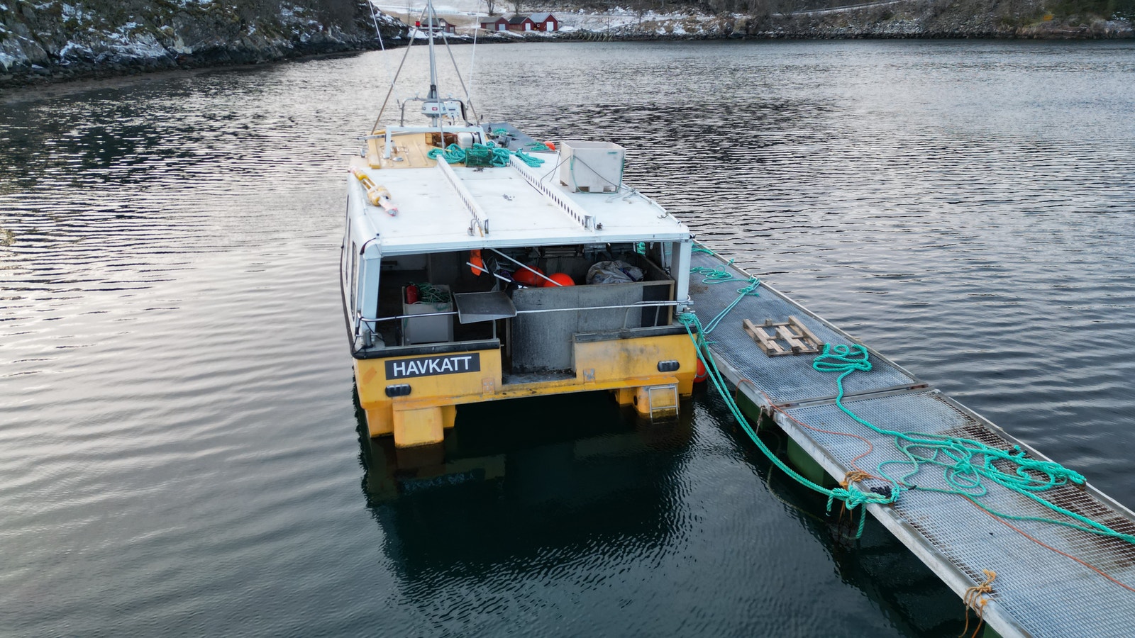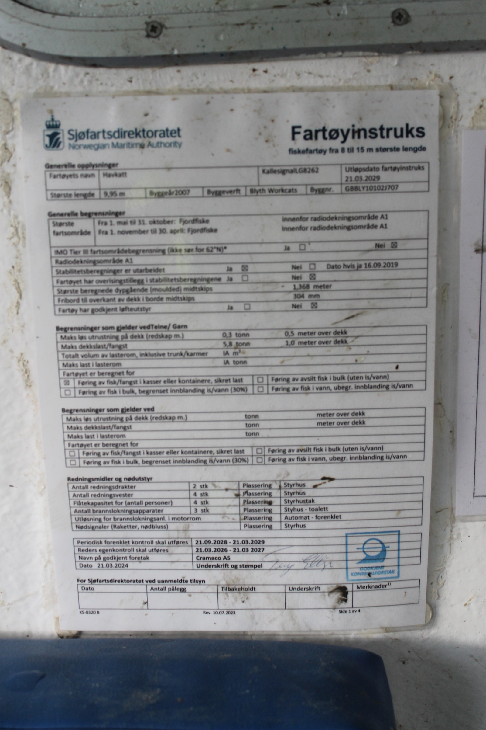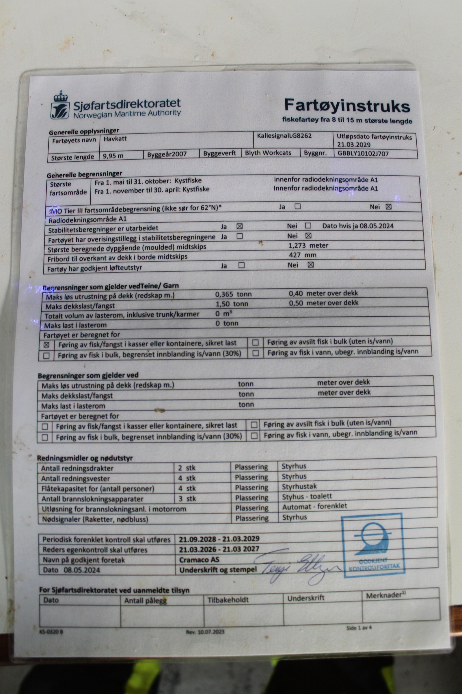 Katamaran med Fartøyinstruks for Fjordfiske og Kystfiske gyldige til 21.03.2029.