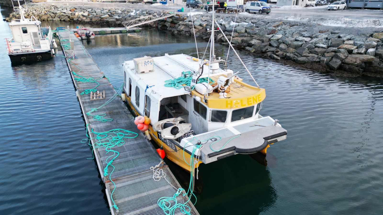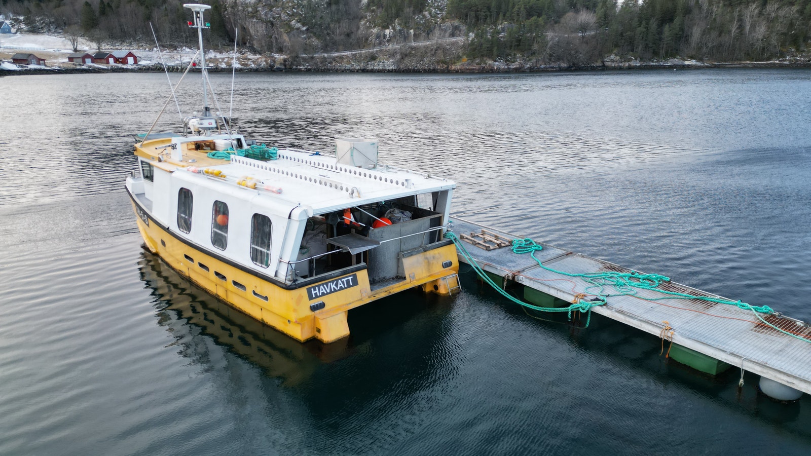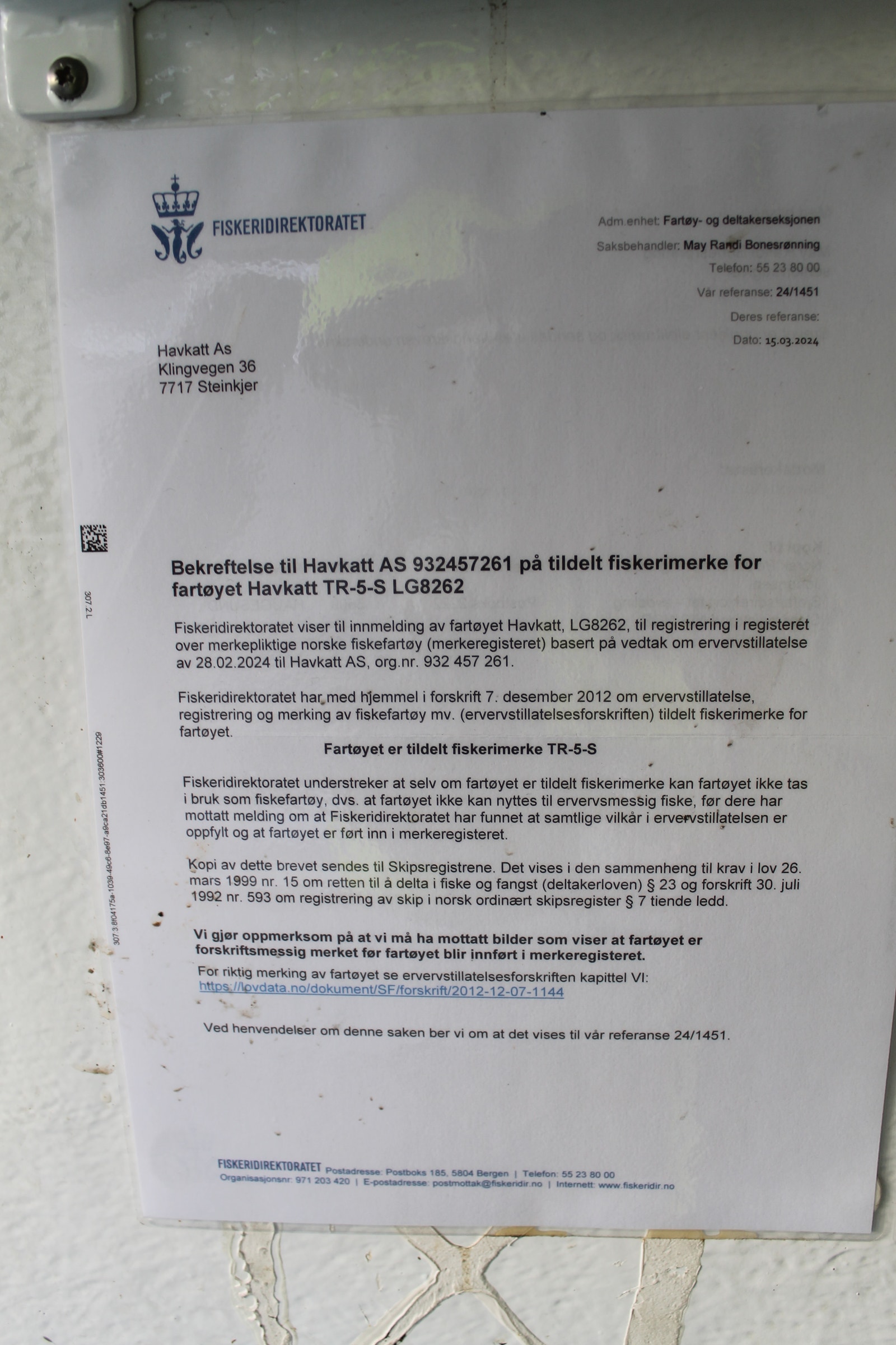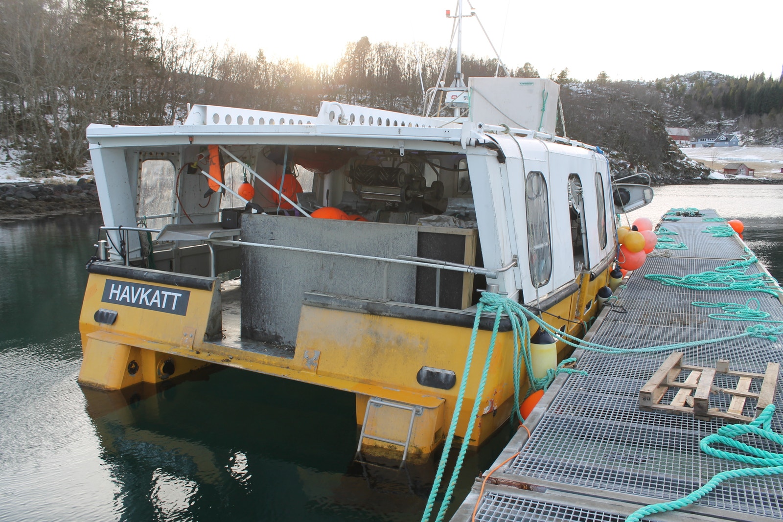 Katamaran med Fartøyinstruks for Fjordfiske og Kystfiske gyldige til 21.03.2029.